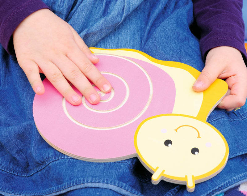 De slak heeft een gefreesde spiraal.Gelakt multiplex (kleuren: geel, roze)Afm. 16 x 21 cm