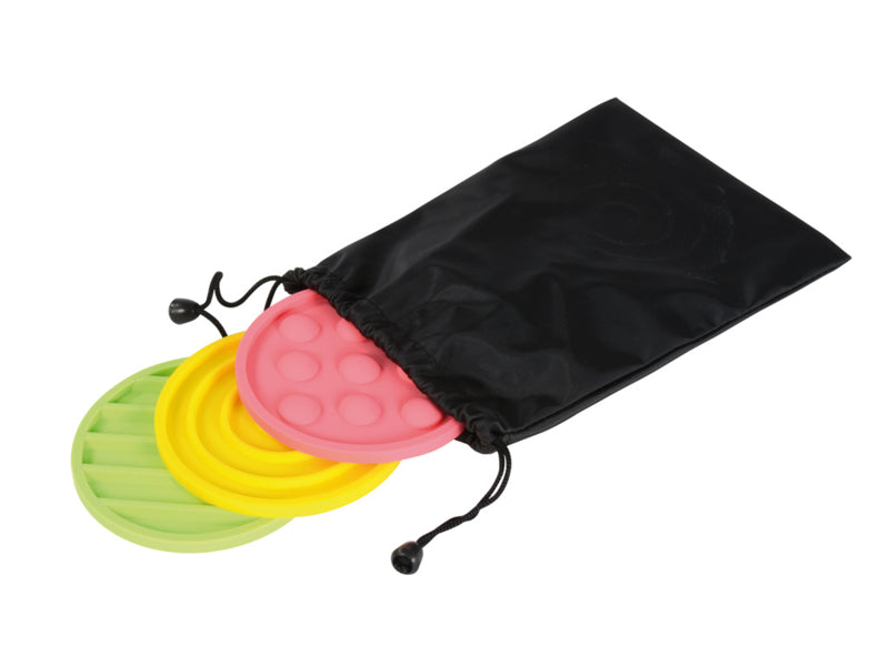 De set bestaat uit 5 grote en 5 kleine vormen en een zak.