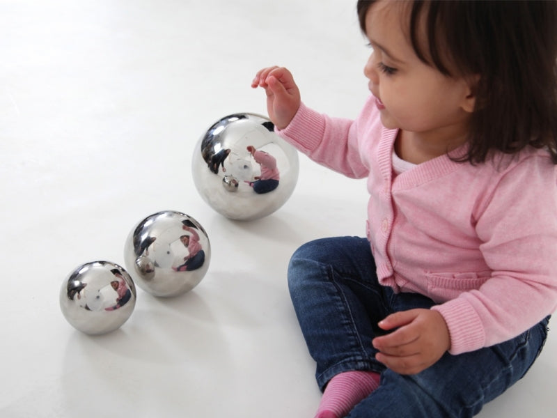 Het kind kan het eigen spiegelbeeld in de bal zien.