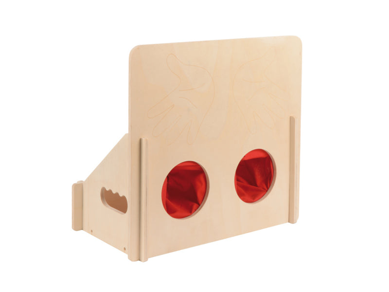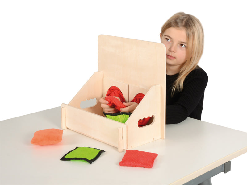 Vanaf de achterkant kun je eenvoudig verschillende voorwerpen in de doos plaatsen om ze te voelen. De hoge voorkant met twee grijpgaten en manchetten is een geweldig privacyscherm zodat de kinderen niet vals spelen bij het raden van het zintuiglijke materiaal. Aan de zijkant heeft de doos twee gripgaten voor gemakkelijk dragen. Eenvoudige opslag, omdat het gemakkelijk en stabiel kan worden aangesloten.