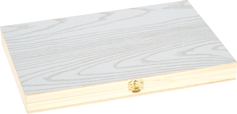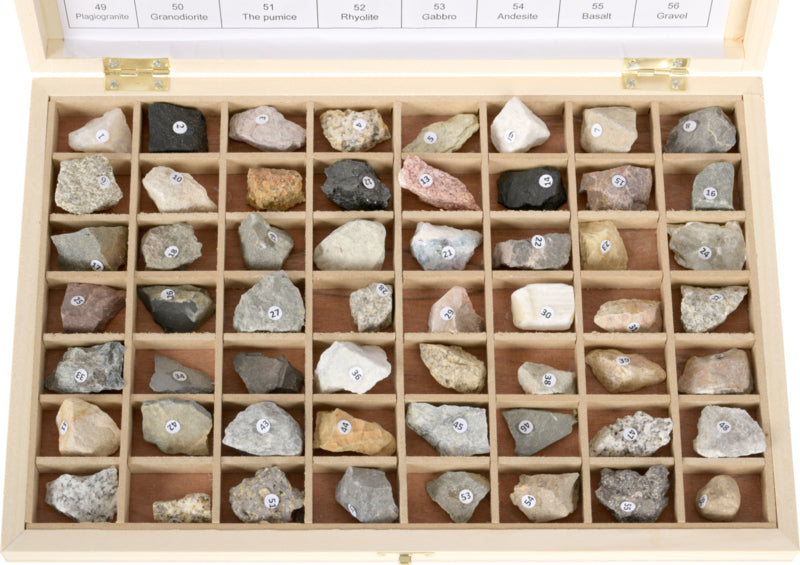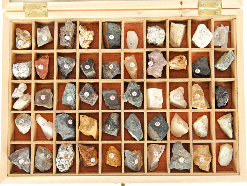 Een set van 56 verschillende stenen en mineralen in een houten kist.