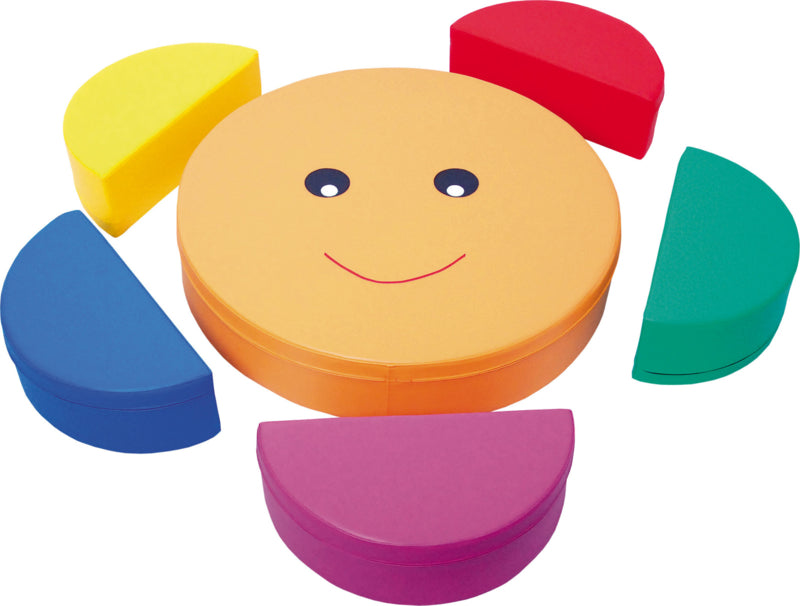 Een set van 6 poefs in 6 kleuren die op verschillende manieren kunnen worden opgesteld of kan dienen als tafel met halfronde zitjes.