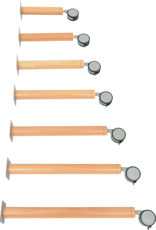 Een set van 4 ronde poten voor Flexi tafelbladen, twee met wielen en twee zonder wielen, na bevestiging op het tafelblad geven ze de volgende hoogte 76 cm