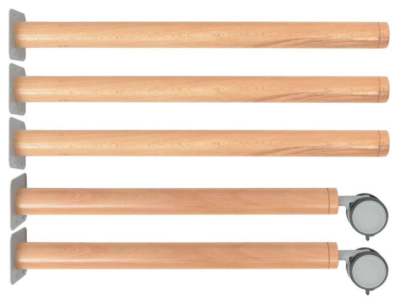 Een set van 5 poten ,waarvan 2 zijn uitgerust met wieltjes met een rem. Massief hout.