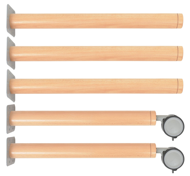 Een set van 5 poten ,waarvan 2 zijn uitgerust met wieltjes met een rem. Massief hout.