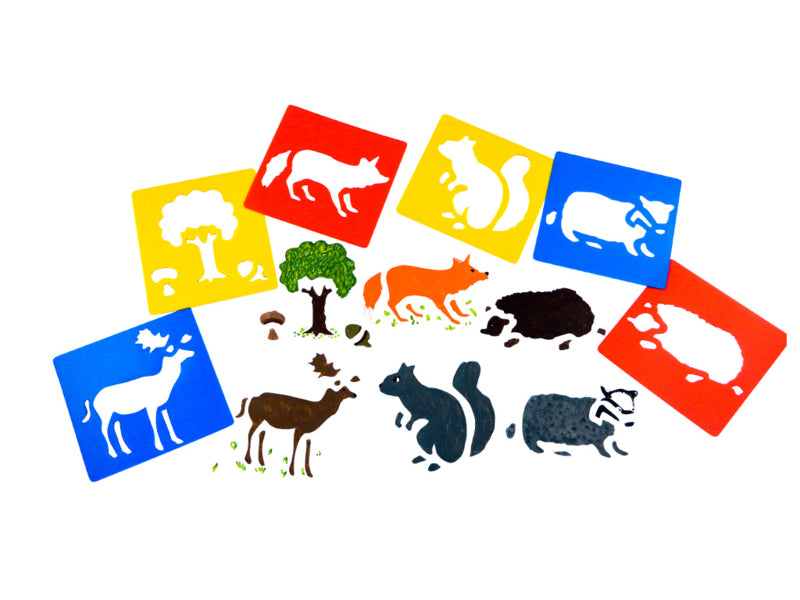 Wasbare plastic stencils (hert, das, eekhoorn, vos, boom en egel). Ideaal voor gebruik met verf, kleurpotloden, potloden en viltstiften. Gemaakt van robuust kunststof, gemakkelijk wasbaar en herbruikbaar. Deze kleurrijke plastic stencils zijn bedoeld voor gebruik door kinderen. Ze zijn geweldig voor het bevorderen van creativiteit en hand-oogcoördinatie.