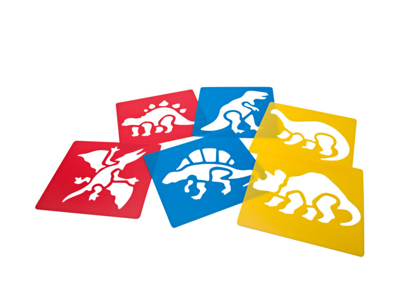 Wasbare plastic stencils (Tyrannosaurus Rex, Triceratops, Stegosaurus, Pterodactyl, Dimetrodon en Brontosaurus). Ideaal voor gebruik met verf, kleurpotloden, potloden en viltstiften. Gemaakt van robuust kunststof, gemakkelijk wasbaar en herbruikbaar. Deze kleurrijke plastic stencils zijn bedoeld voor gebruik door kinderen. Ze zijn geweldig voor het bevorderen van creativiteit en hand-oogcoördinatie.