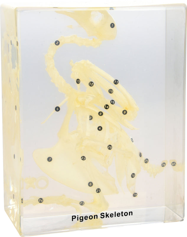 Natuurlijke skeletten van dieren (hagedis, konijn, duif, vis, pad) geplaatst in duurzaam plexiglas. Skeletten zijn nuttige leermiddelen die de implementatie van het biologie curriculum op verschillende onderwijsniveaus vergemakkelijken. Hiermee kunnen leraren laten zien hoe de botstructuur van het dier er uitziet, bijvoorbeeld hoe ze moeten bewegen. Bij de voorbereidingen zijn de belangrijkste skeletelementen gemarkeerd met nummers. De opgenomen legenda bevat de namen van de geselecteerde elementen in het Engels.