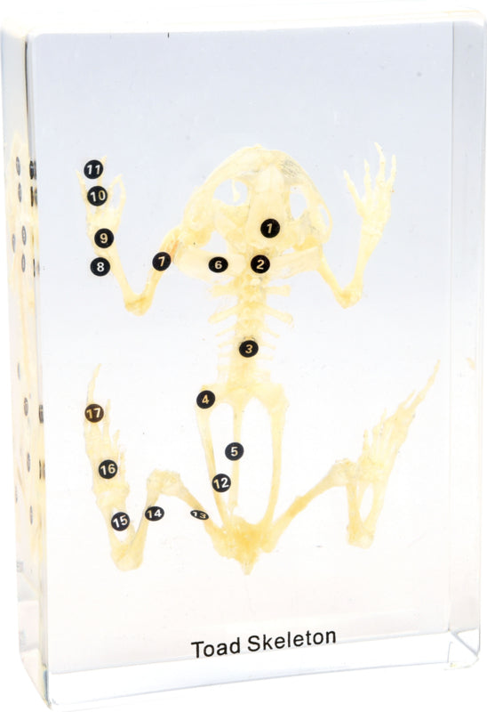 Natuurlijke skeletten van dieren (hagedis, konijn, duif, vis, pad) geplaatst in duurzaam plexiglas. Skeletten zijn nuttige leermiddelen die de implementatie van het biologie curriculum op verschillende onderwijsniveaus vergemakkelijken. Hiermee kunnen leraren laten zien hoe de botstructuur van het dier er uitziet, bijvoorbeeld hoe ze moeten bewegen. Bij de voorbereidingen zijn de belangrijkste skeletelementen gemarkeerd met nummers. De opgenomen legenda bevat de namen van de geselecteerde elementen in het Engels.