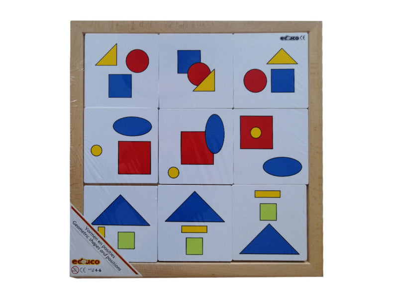 Houten Educo inlegbord met 9 stukken met verschillende vormen en posities.