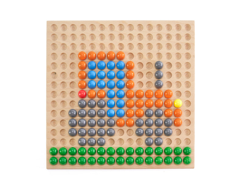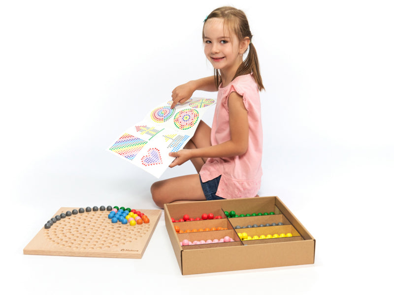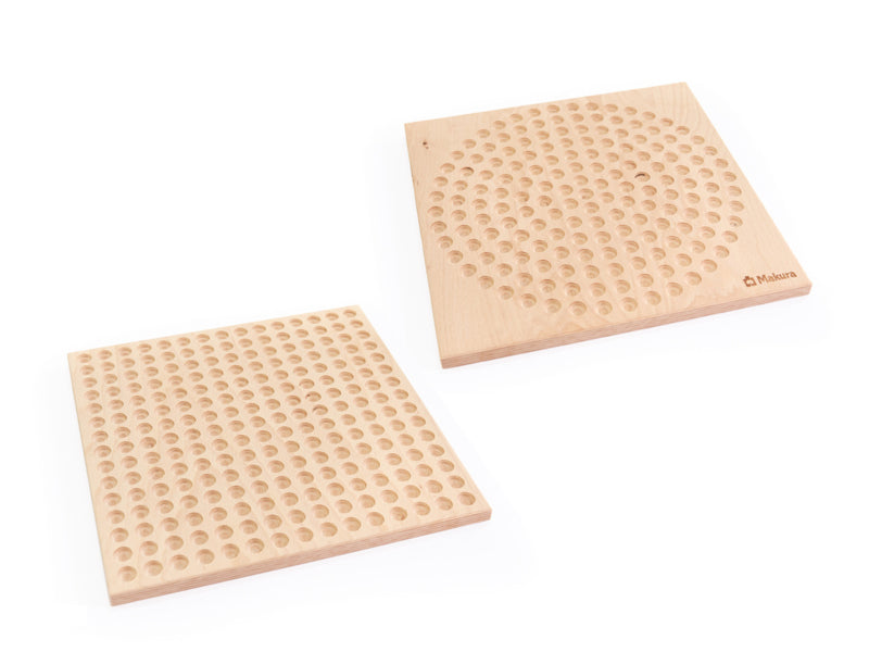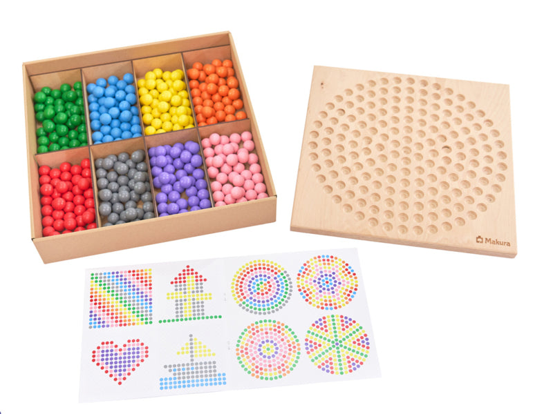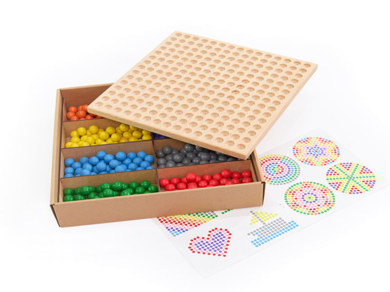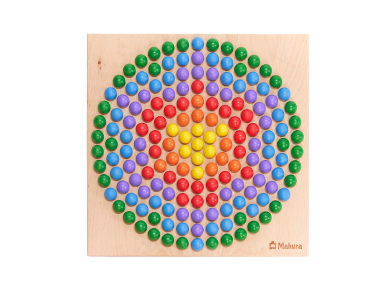 Het dubbelzijdige houten spelbord heeft een rond en een vierkant oppervlak met uitsparingen voor de houten ballen en biedt dus veel mogelijkheden: Gebruik de sjablonen om motieven toe te voegen, mandala's te maken, een driedimensionale piramide in de kleuren van de regenboog te bouwen of patronen te ontwerpen naar eigen ontwerp. Ook kunnen kinderen boter-kaas-en-eieren spelen.