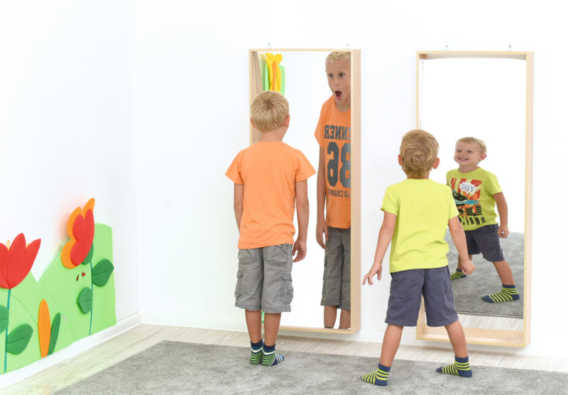 spiegels Deze spiegels vervormen het beeld en geeft de kinderen veel plezier. Ze kunnen grappige gezichten maken en een verdraaide weerspiegeling van hun silhouet observeren. Het kan vele uren de aandacht van kinderen trekken. De niet-versplinterende spiegel van acryl is geplaatst in een stabiel frame van gelamineerd board in een berken kleur. Hangbaar aan de muur
