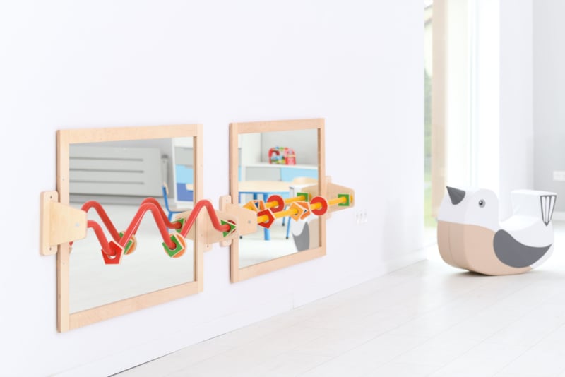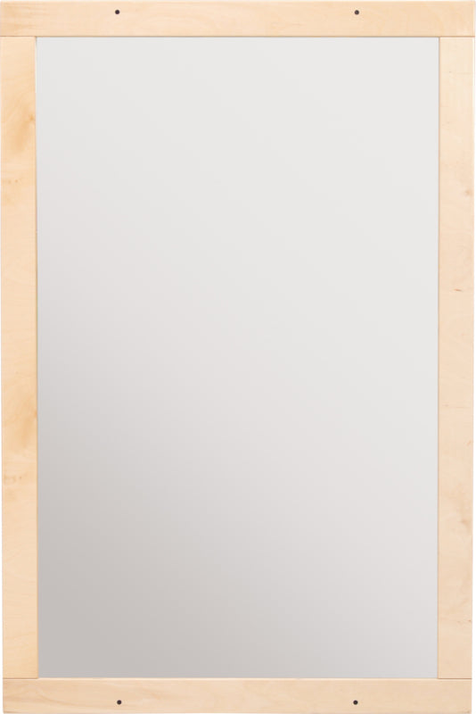 Het frame is gemaakt van multiplex en kan worden uitgerust met grappige kleurrijke MDF-toepassingen (100379, afzonderlijk verkrijgbaar). De spiegel kan ook worden uitgerust met een metalen frame (rechtstreeks aan de muur bevestigd) met manipulatieve kleurrijke, houten vormen (100380 of 100381, afzonderlijk verkrijgbaar).