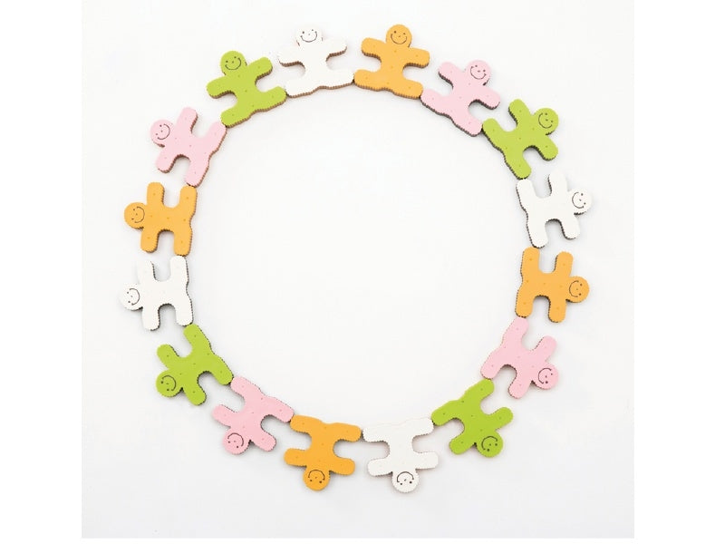 Inhoud: 16 stapel mannetjes in 4 kleuren: melkwit, roze/rood, appelgroen en geel (de deksels zijn donker- en middelbruin).