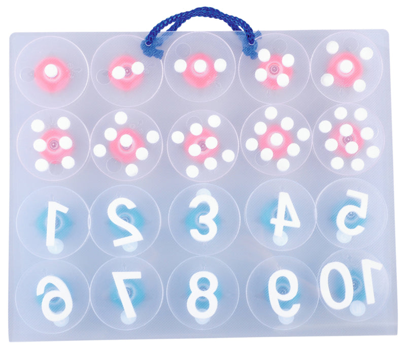 10 stempels met cijfers en 10 stempels met stippen in plastic opbergdoos.