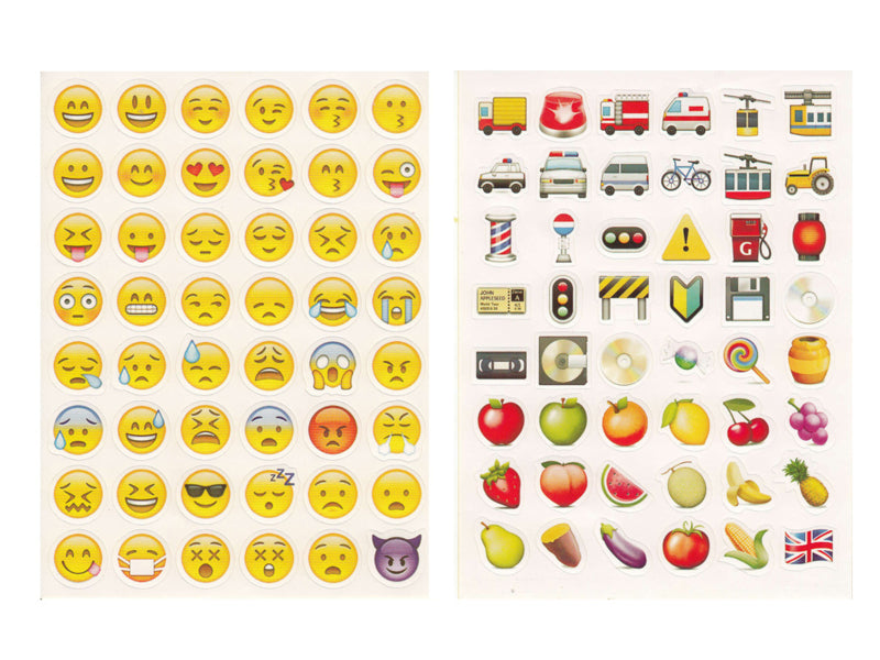 16 vel met stickers met diverse onderwerpen emoji stickers, stickers voertuigen, fruit, transport, sport, eten, dieren etc.