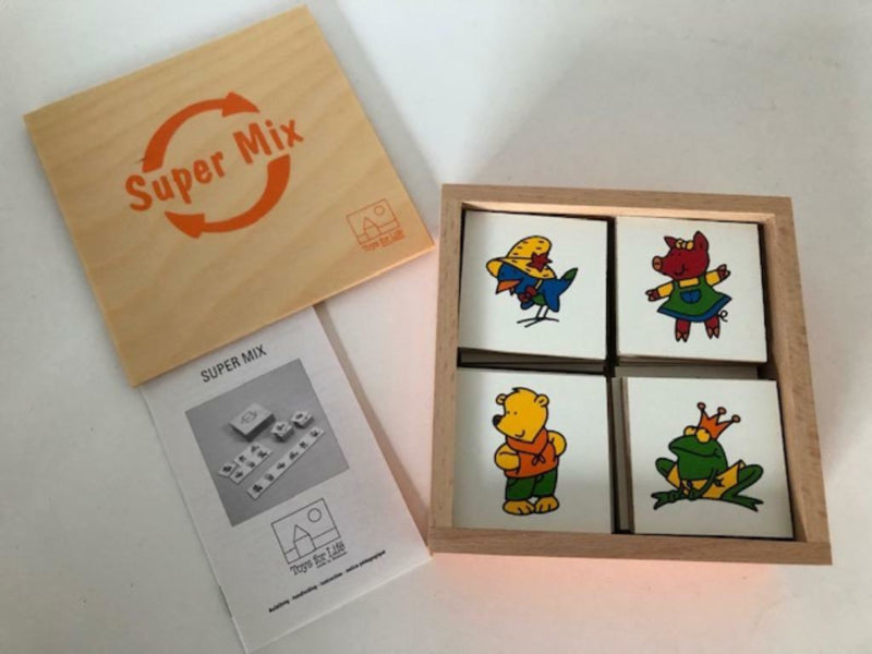 Het SuperMix memory-spel oefent in sterke mate het concentratievermogen en het geheugen. Het aanlegspel oefent bovendien het observatievermogen en vormherkenning. SuperMix bestaat uit een kist (13,5 x 13,5 x 4 cm), 28 plankjes tweezijdig bedrukt (5,5 x 5,5 cm) en een handleiding.