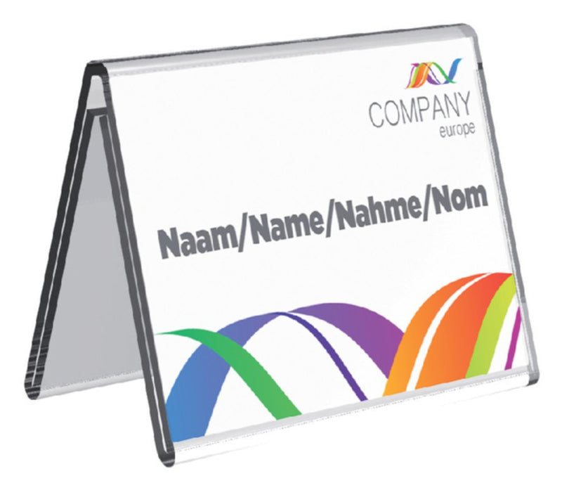 - Kaarthouder in dakvorm voor een glasheldere naampresentatie op bureaus, de balie en voor vergaderingen.
