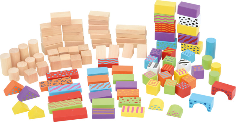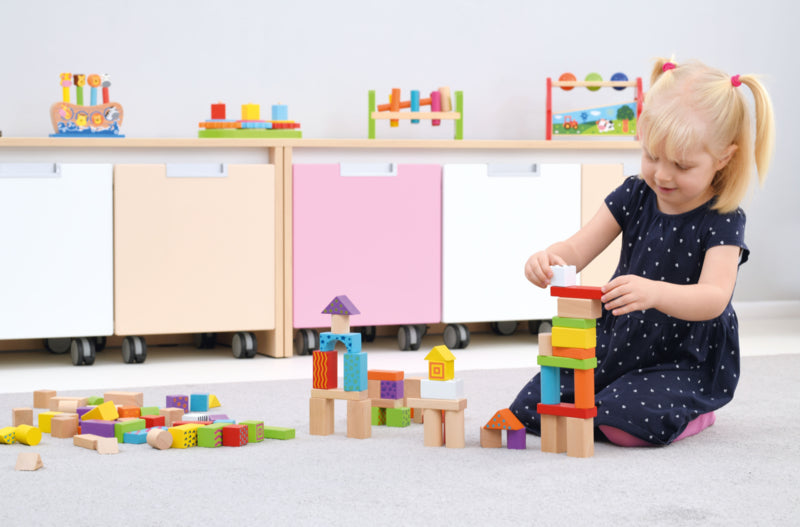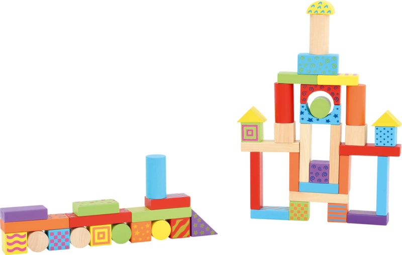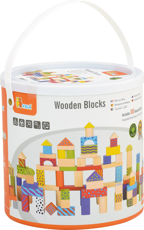 Set kleurrijke blokken van hout, verpakt in een handige emmer van hard karton met plastic deksel en handvat.