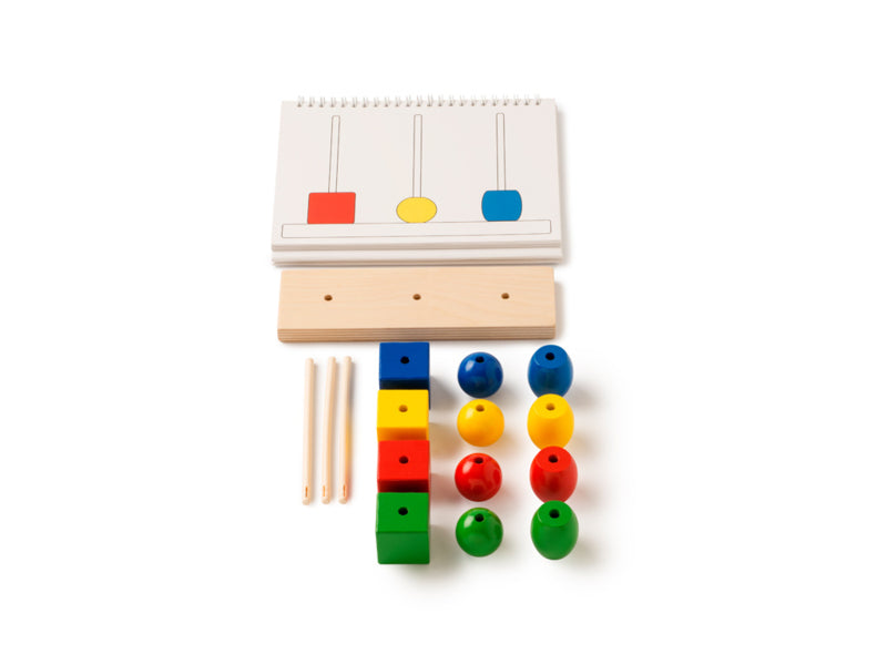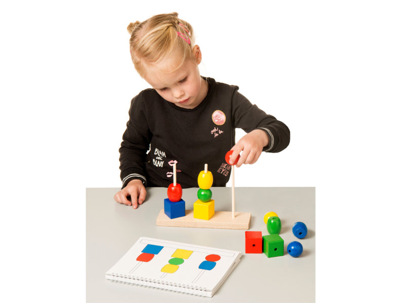 Inhoud: Ringband boekje met 12 pagina's, standaard met 3 stokken, 12 blokken in 3 kleuren, gebruiksaanwijzing.