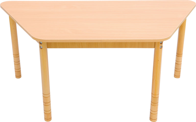 Tafelblad van gelamineerd spaanplaat in een esdoorn kleur (dikte 18 mm.) met randafwerking van duurzaam, kleurrijk PVC (dikte 2 mm.).