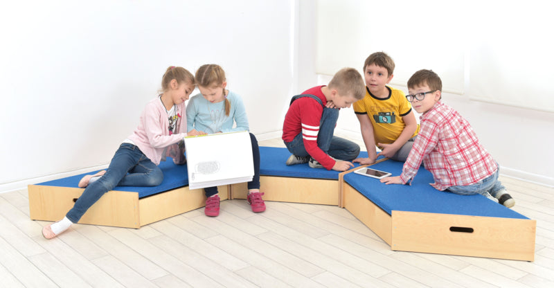 Platform van hout waarmee verschillende opstellingen kunnen worden gemaakt. Ze zijn uitgerust met rubberen voetjes om krassen op de vloer te voorkomen. Bedekt met antislip tapijt.