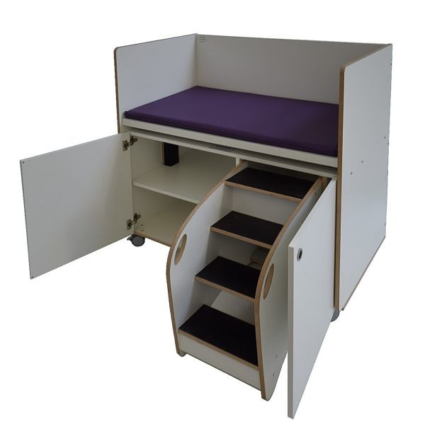 Wit (extra breed) basismodel commode, verrijdbaar. De trap is opgeborgen in het linkerkastje en kan eenvoudig aangetrokken en stevig vastgezet worden. De commode is elektrisch in hoogte verstelbaar (85-105 cm). Exclusief aankleedkussen. Optioneel: in berken verkrijgbaar.