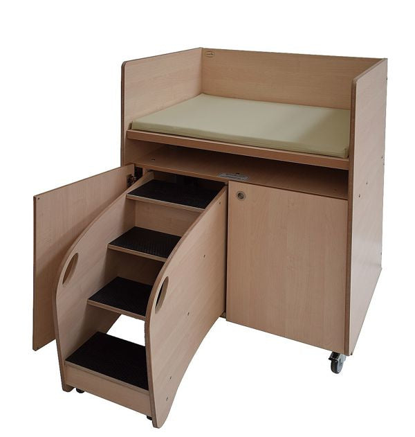 Basismodel commode, verrijdbaar. De trap is opgeborgen in het linkerkastje en kan eenvoudig aangetrokken en stevig vastgezet worden. De commode is elektrisch in hoogte verstelbaar (85-105 cm). Exclusief aankleedkussen. Optioneel: in wit verkrijgbaar (E004), front in kleur (meerprijs € 100), losse spoelbakkast.