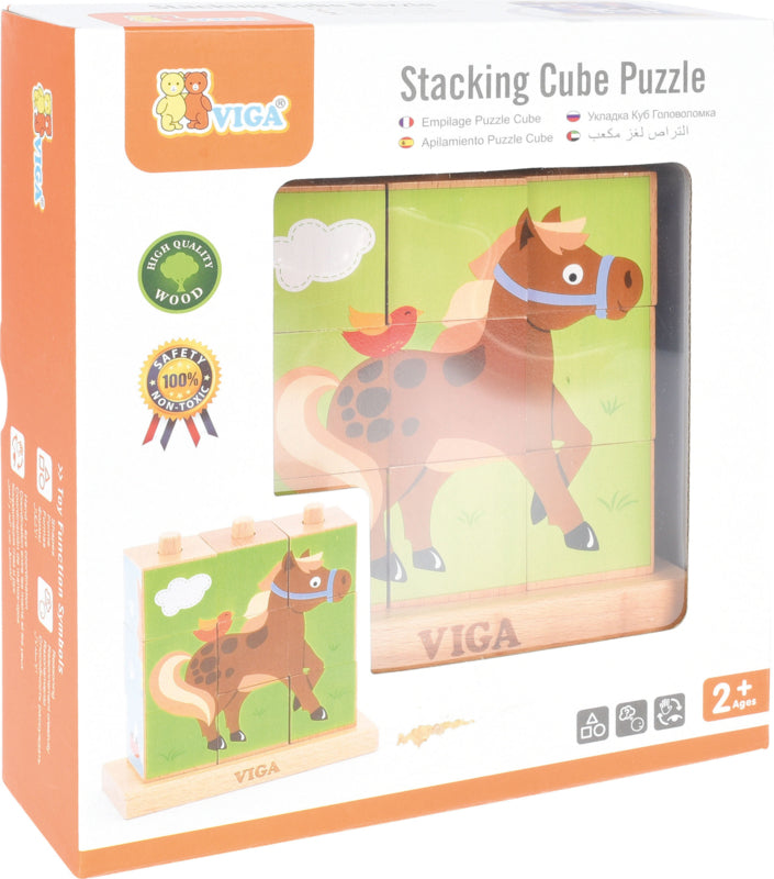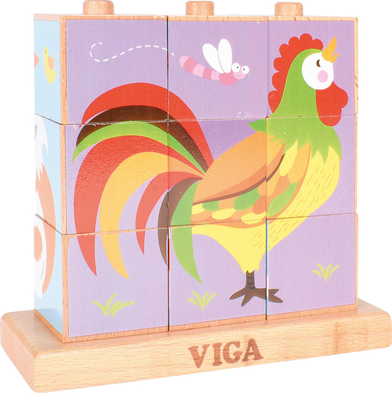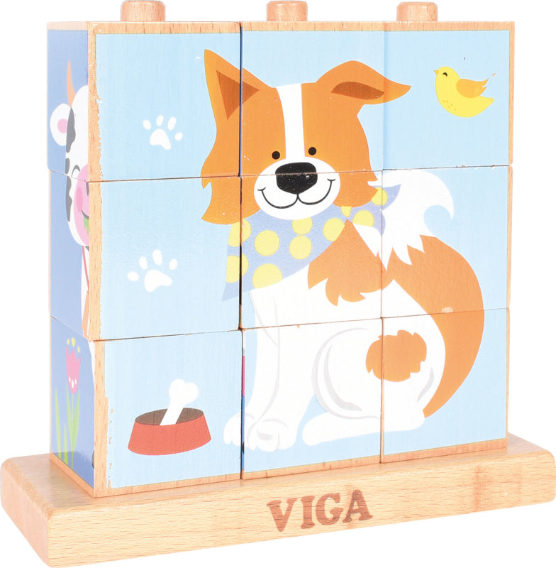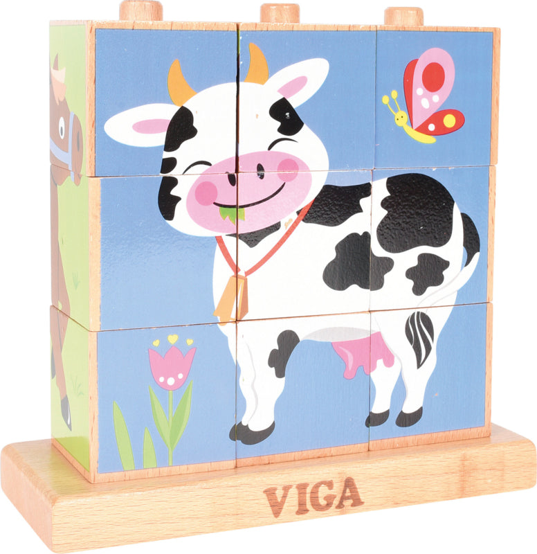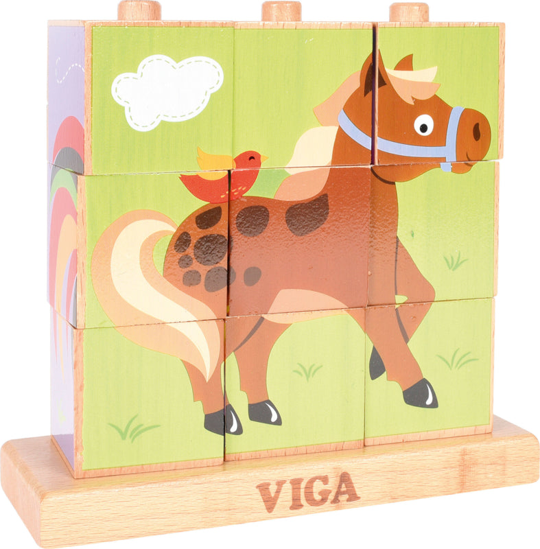 Ongewone, driedemensionale puzzels voor kinderen, gemaakt van hout. Afhankelijk van hoe we de blokken plaatsen, maken we plaatjes van 4 verschillende dieren die op de boerderij leven (hond, paard, koe en haan).