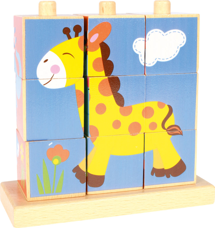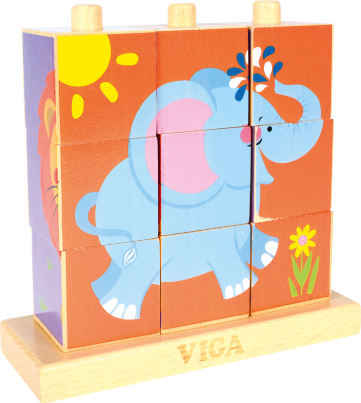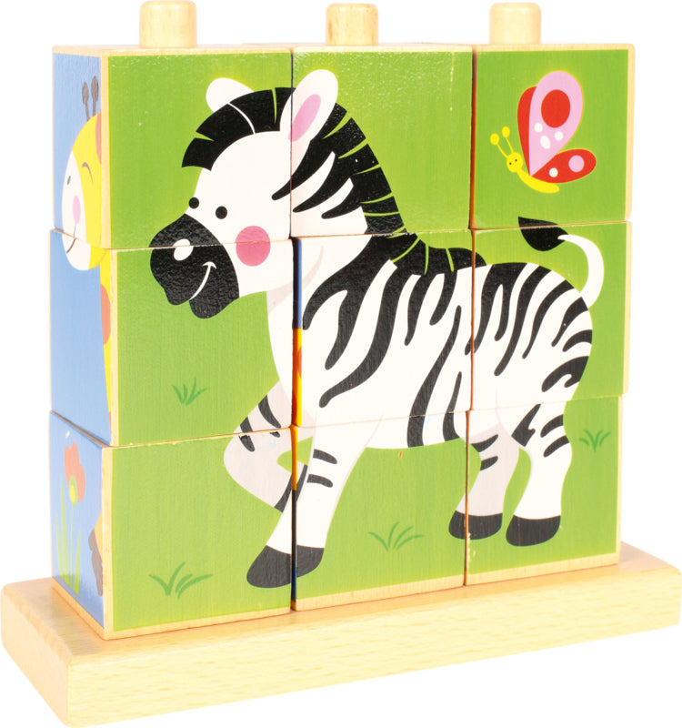 Ongewone, driedimensionale puzzels voor kinderen, gemaakt van hout. Afhankelijk van hoe we de blokken plaatsen, maken we plaatjes van 4 verschillende wilde dieren die in het wild leven (leeuw, giraf, zebra en olifant).