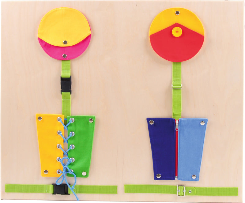 Verschillende soorten bevestigingen leren basisvaardigheden en zijn nuttig tijdens het aankleden en ontwikkelen tegelijkertijd de vinger vaardigheid.