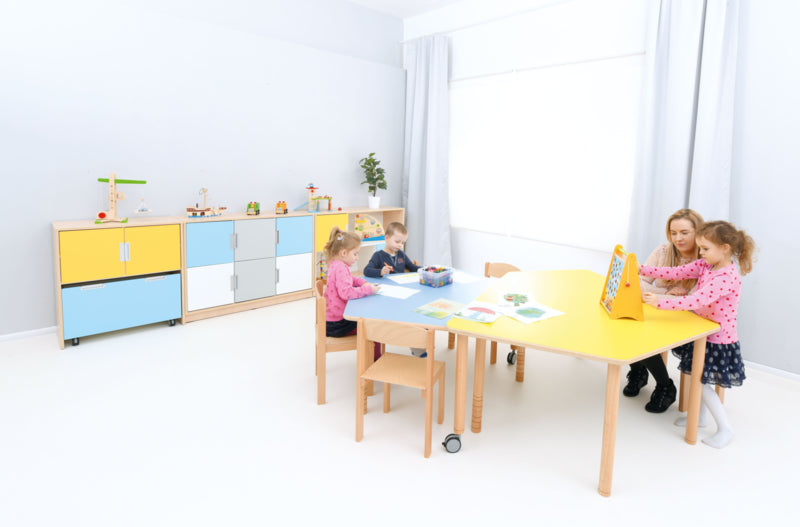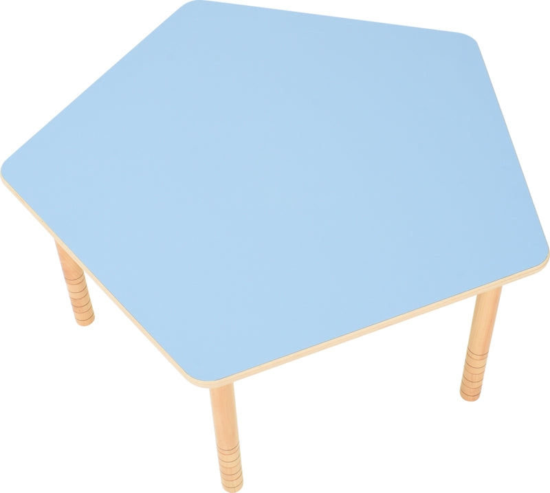Tafelblad van multiplex ( dikte 25mm), gelamineerd met kleurrijke HPL. HPL is een thermohardend materiaal, bestand tegen krassen en stoten, met een hoge weerstand tegen chemische middelen en hoge temperaturen.