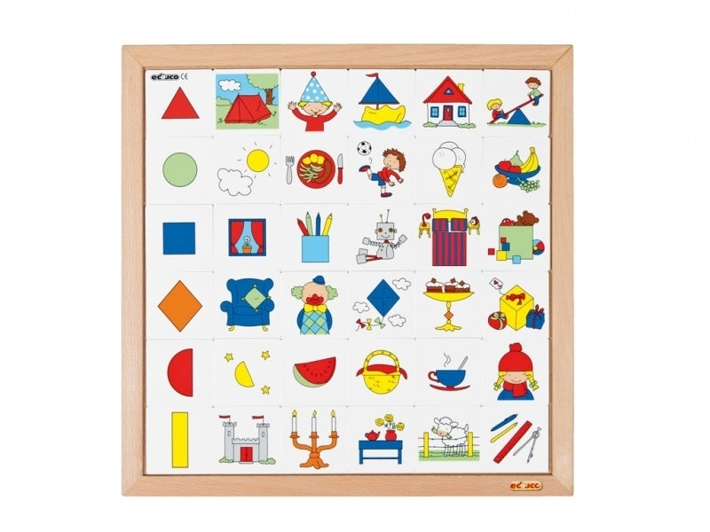 Leg op de eerste rij de plaatjes met de geometrische vormen. Daarna probeer je in de kaartjes met alledaagse objecten, dezelfde vorm terug te vinden.