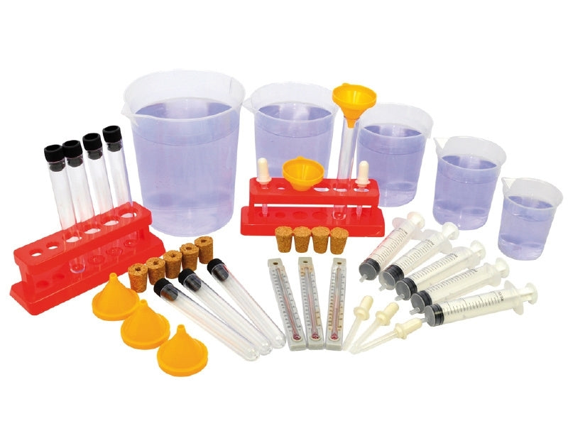 Inhoud: 5 maatbekers, 8 reageerbuisjes, 5 trechters, 5 pipetten, 3 thermometers, kurk...