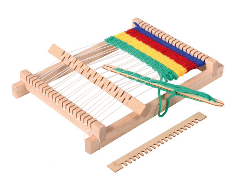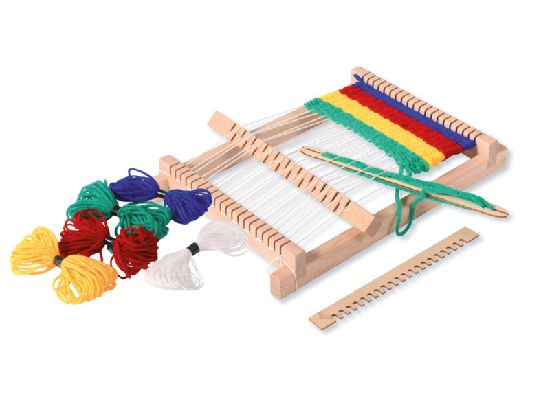 De kleine en grote weefgetouwen kunnen worden gebruikt om geweldige stoffen te weven voor pannenlappen, kleedjes of tassen. Rijg het gewoon met het kettinggaren, wikkel de ingesloten wol om de schietspoel en er ontstaat een stevig weefstuk van wollen draden. De kam wordt gebruikt om de schoten te comprimeren. Weven traint oog-handcoördinatie, concentratie en fijne motoriek.