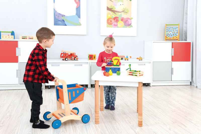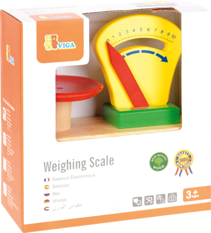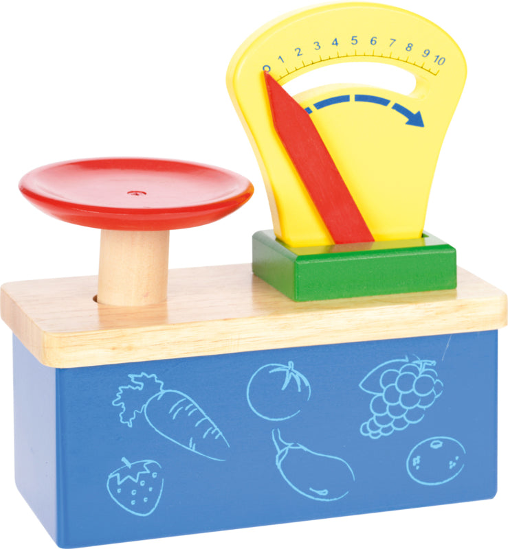 Houten weegschalen zijn handig bij het naspelen van een winkel. Na het plaatsen van een pan zwaait de wijzer op een schaal van 1 tot 10 (de balans geeft de massaverschillen niet nauwkeurig weer).