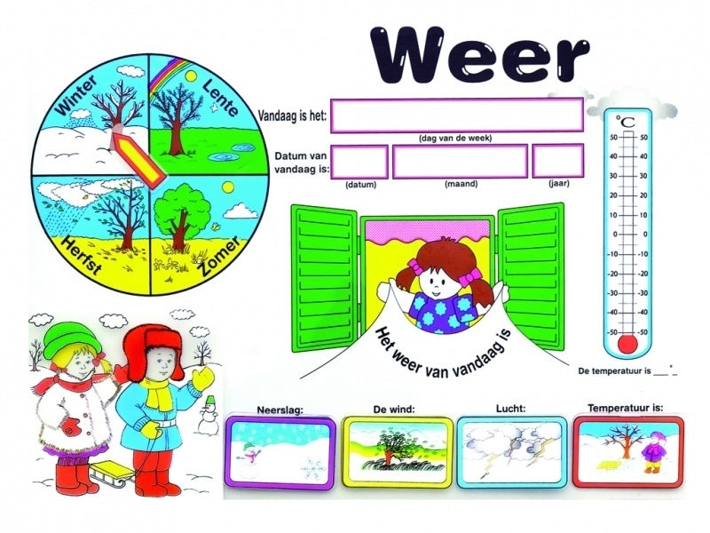 Met deze vrolijke weerkalender kunnen de kinderen spelenderwijs de 4 jaargetijden en de diverse weertypes aanleren. Voor de oudere kinderen biedt de weerkalender de mogelijkheid om iedere dag zelf het weerbericht te maken.