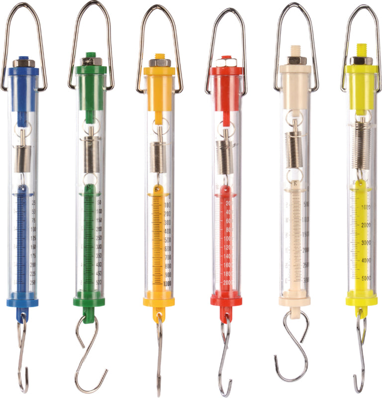 De veerschalen maken de weerstand zichtbaar: tijdens het wegen of testen van krachten trekt de veer zichtbaar uit elkaar. De transparante kast is bedrukt met gram- en Newton-schalen.