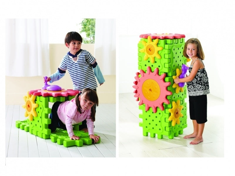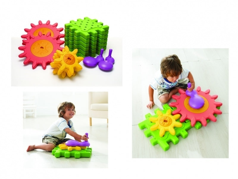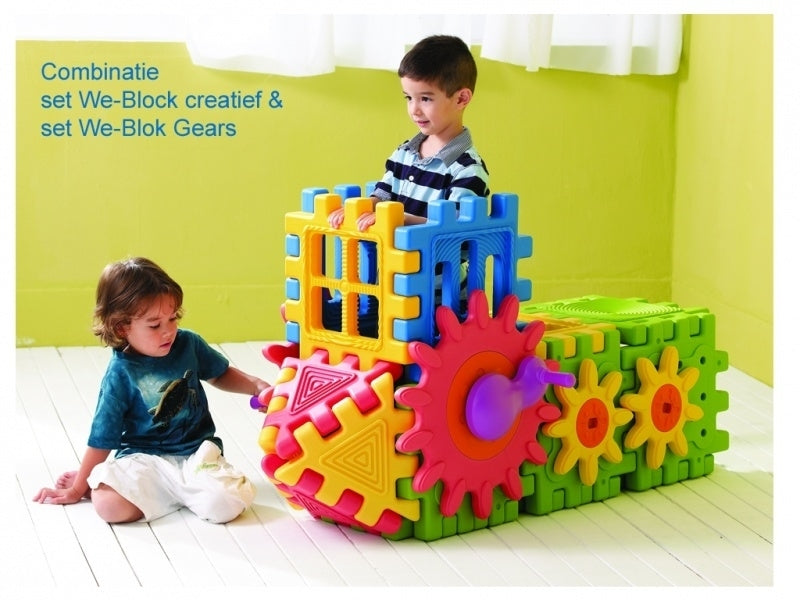 Inhoud: 6 platte elementen, 2 draaidelen, 2 grote tandraders, 2 kleine tandraders.