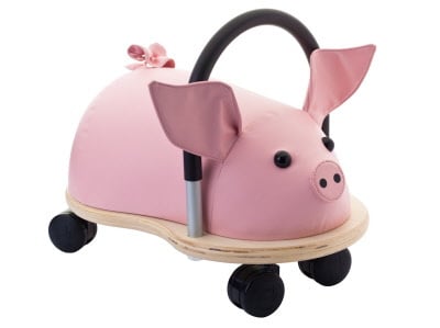 De Wheelybug is een loopwagen in de vorm van een biggetje, bij, koe, muis, tijger of lieveheersbeestje, met 4 zwenkwieltjes waardoor kinderen in een kleine ruimte alle kanten op kunnen draaien.De body is gemaakt van zacht gepolsterd vinyl. Door de duwbeugel kan je er veilig op zitten en rondjes rijden. De Wheelybug is al leuk voor 1 jarigen, want je kunt hem ook heerlijk knuffelen, wegduwen of als loophulp gebruiken. En als ze de eerste stapjes zetten duurt het niet meer lang voordat ze erop wegrijden.