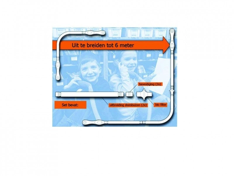 De uitbreidingsset bevat: 2 x uitbreiding stembuizen 2 x buisverbindingen 1 x biofilter om de verspreiding van ziektekiemen zoveel mogelijk te beperken.