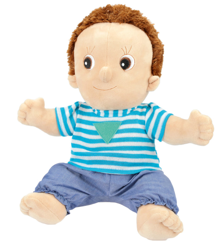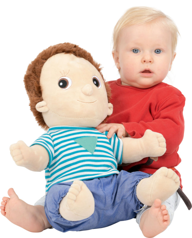 Zachte pop bedekt met pluche materiaal, gedeeltelijk gevuld met bonen, verwijderbare kleren.