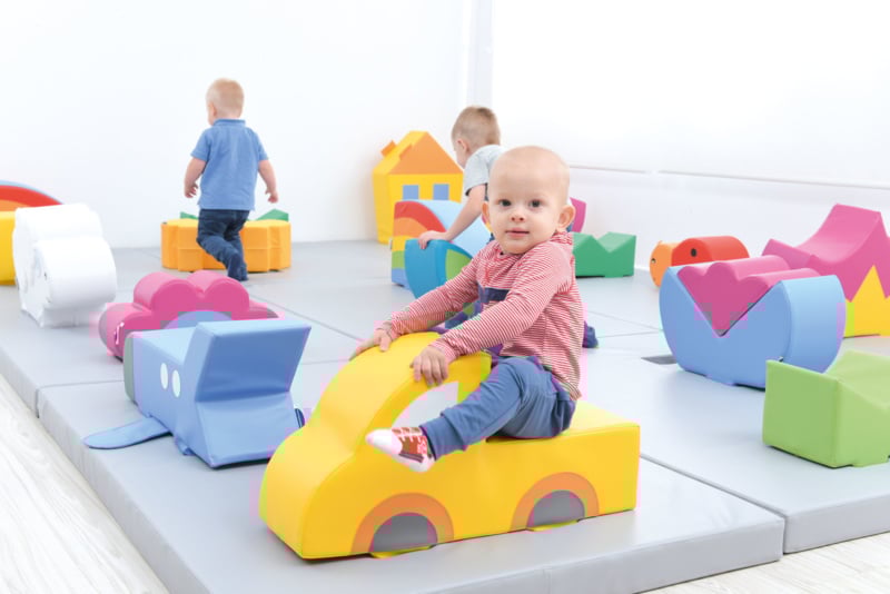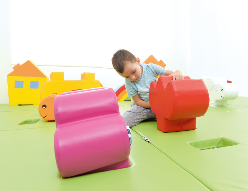 Set foamblokken gemaakt om hindernisbanen voor de jongste kinderen te maken. Ontwikkelt en oefent motorische coördinatie. Het is een geweldige plek om voor peuters te spelen. Elementen van verschillende hoogtes en hoeken moedigen aan om te kruipen, klimmen, obstakels te overwinnen enz., Wat een positieve invloed heeft op de algemene ontwikkeling van het kind en op de motoriek.