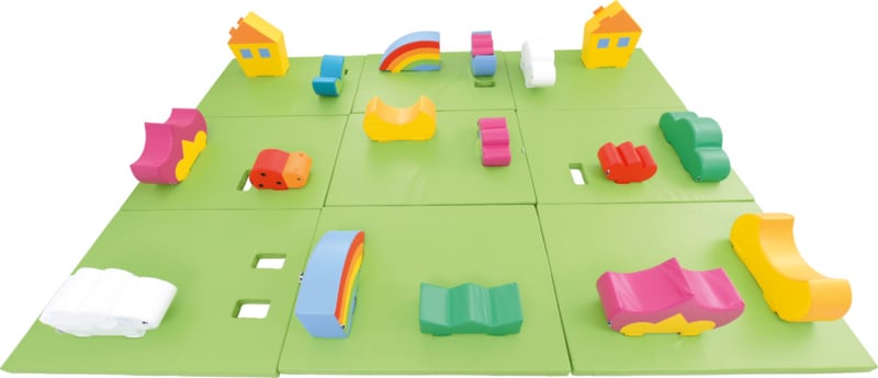 Set foamblokken gemaakt om hindernisbanen voor de jongste kinderen te maken. Ontwikkelt en oefent motorische coördinatie. Het is een geweldige plek om voor peuters te spelen. Elementen van verschillende hoogtes en hoeken moedigen aan om te kruipen, klimmen, obstakels te overwinnen enz., Wat een positieve invloed heeft op de algemene ontwikkeling van het kind en op de motoriek.