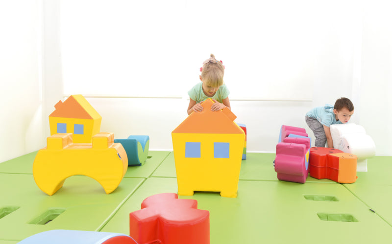 Set foamblokken gemaakt om hindernisbanen voor de jongste kinderen te maken. Ontwikkelt en oefent motorische coördinatie. Het is een geweldige plek om voor peuters te spelen. Elementen van verschillende hoogtes en hoeken moedigen aan om te kruipen, klimmen, obstakels te overwinnen enz., Wat een positieve invloed heeft op de algemene ontwikkeling van het kind en op de motoriek.