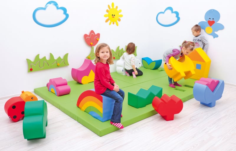Set foamblokken gemaakt om hindernisbanen voor de jongste kinderen te maken. Ontwikkelt en oefent motorische coördinatie. Het is een geweldige plek om voor peuters te spelen. Elementen van verschillende hoogtes en hoeken moedigen aan om te kruipen, klimmen, obstakels te overwinnen enz., Wat een positieve invloed heeft op de algemene ontwikkeling van het kind en op de motoriek.
