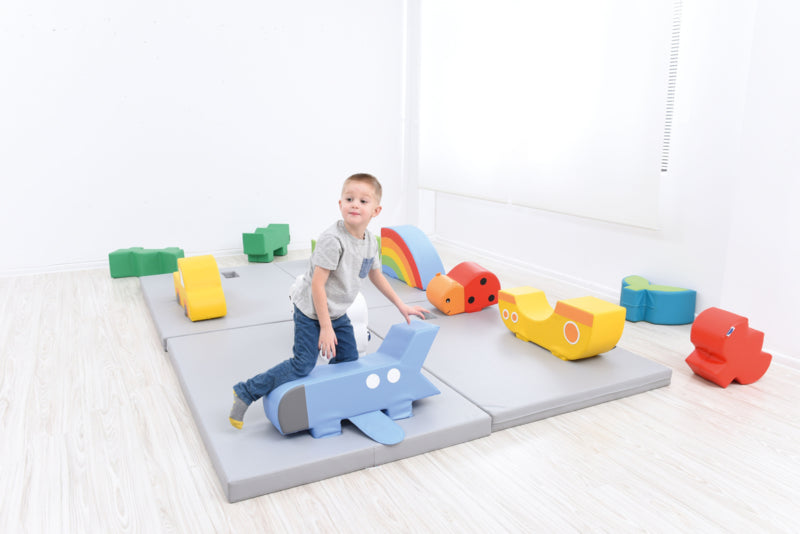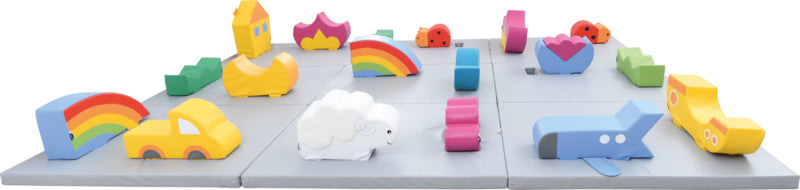 Set foamblokken gemaakt om hindernisbanen voor de jongste kinderen te maken. Ontwikkelt en oefent motorische coördinatie. Het is een geweldige plek om voor peuters te spelen. Elementen van verschillende hoogtes en hoeken moedigen aan om te kruipen, klimmen, obstakels te overwinnen enz., Wat een positieve invloed heeft op de algemene ontwikkeling van het kind en op de motoriek.