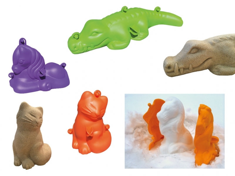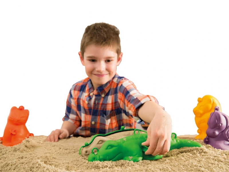 De zandvormen bestaan uit 2 delen die gevuld kunnen worden met vochtig zand.