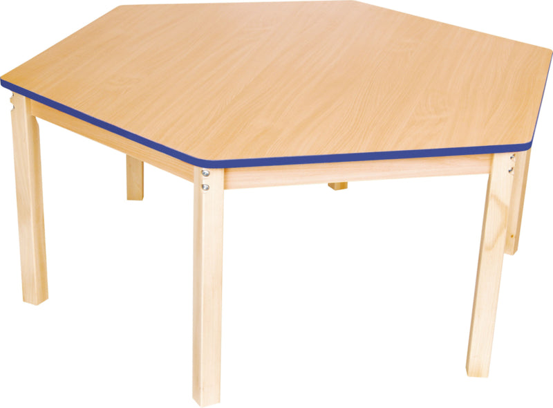 Zeshoekig esdoorn tafelblad met kleurrijke rand blauw