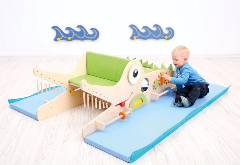 De speelelementen in de vorm van een krokodil moedigen de kinderen aan om creatief te spelen en hun zintuigen te stimuleren.